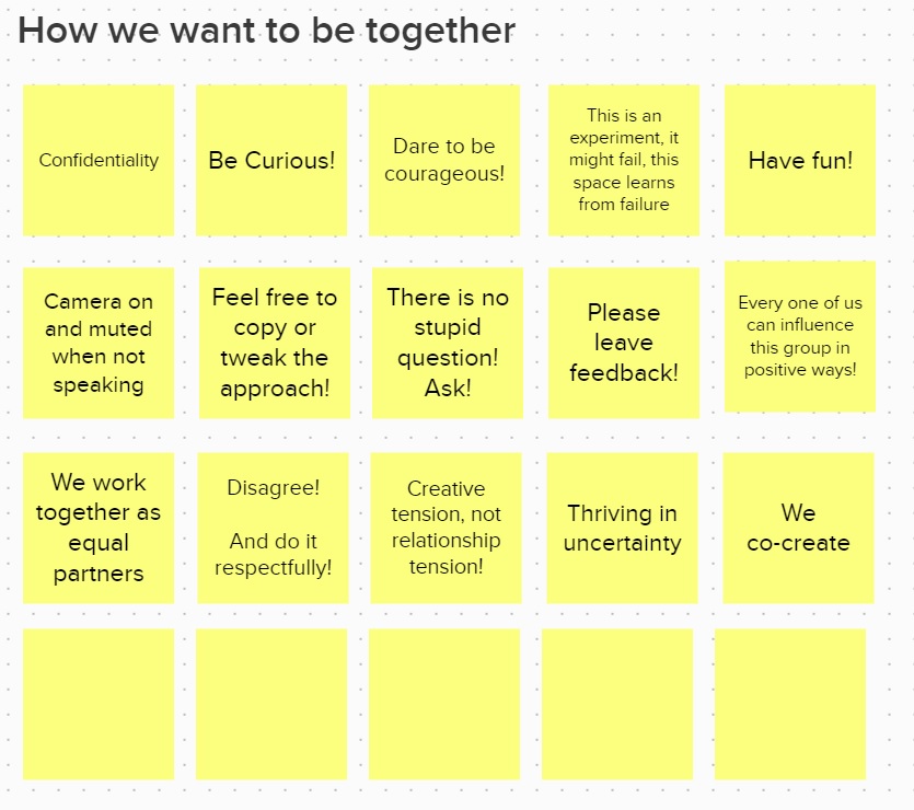 There is a short checkin that both ensures everyone can work with our shared virtual whiteboard and every participant has made their first daring contribution in the first five minutes. We then starts with creating our “how we want to be together” expectations of each other. The section is intentionally open to group co-design.