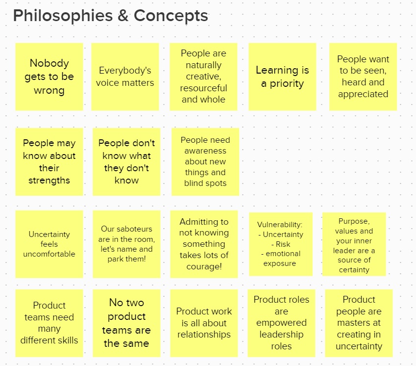 Most importantly there is a box we used for co-creating ideas on how to thrive in uncertainty. Something every product role will have to navigate and learn to be good at. This box can be substituted by any other topic that you as a product lead feel might be where your team has the most to learn (could be culture, could be purpose and vision, could be discovery, etc…). The intention of the box is to involve everyone in the co-creation of ideas how your team might learn more about a topic that has the potential to get your team to thrive and transform. The ultimate aim is building a rockstar team capable to navigate whatever challenge is thrown at them. Here is what came out of a group that recently looked at the topic of Thriving in Uncertainty: