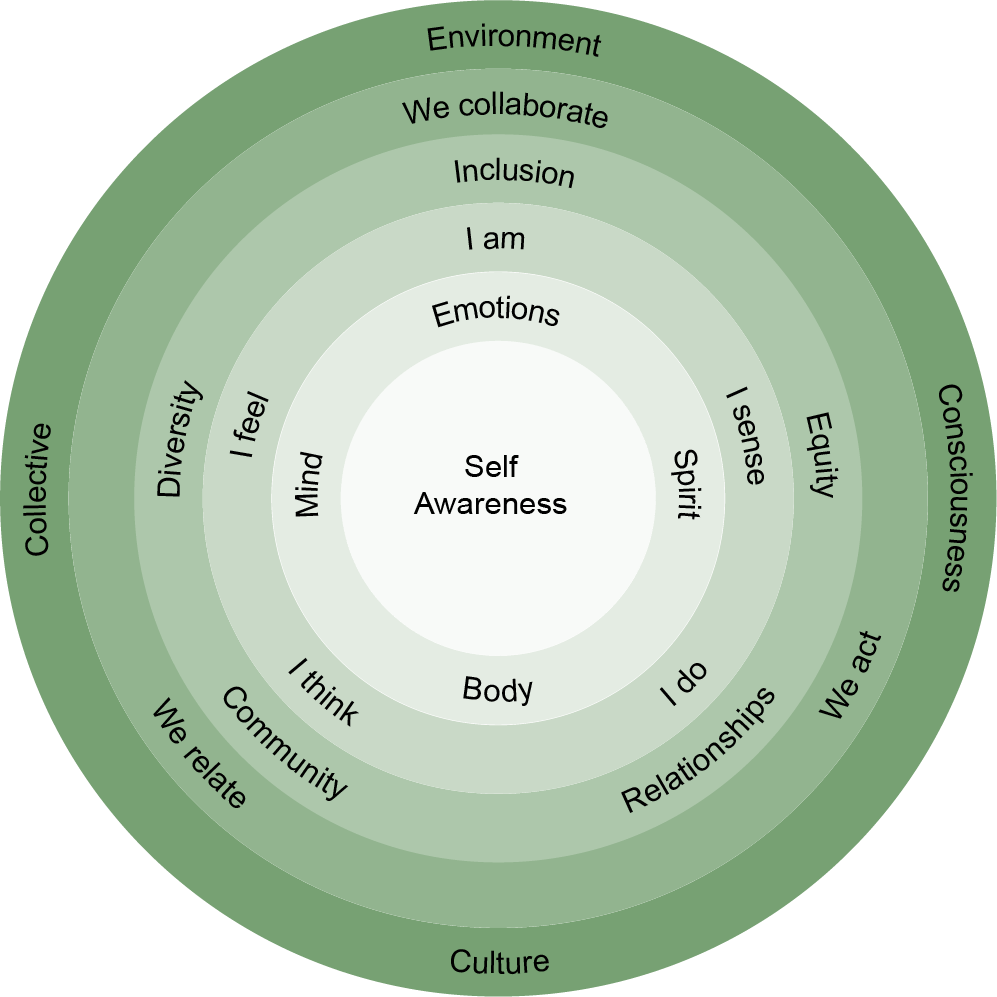 - A holistic exploration of self-leadership (thinking, being, doing, emotions and our bodies) as well leadership in relation with others (relationship and collaboration skills).